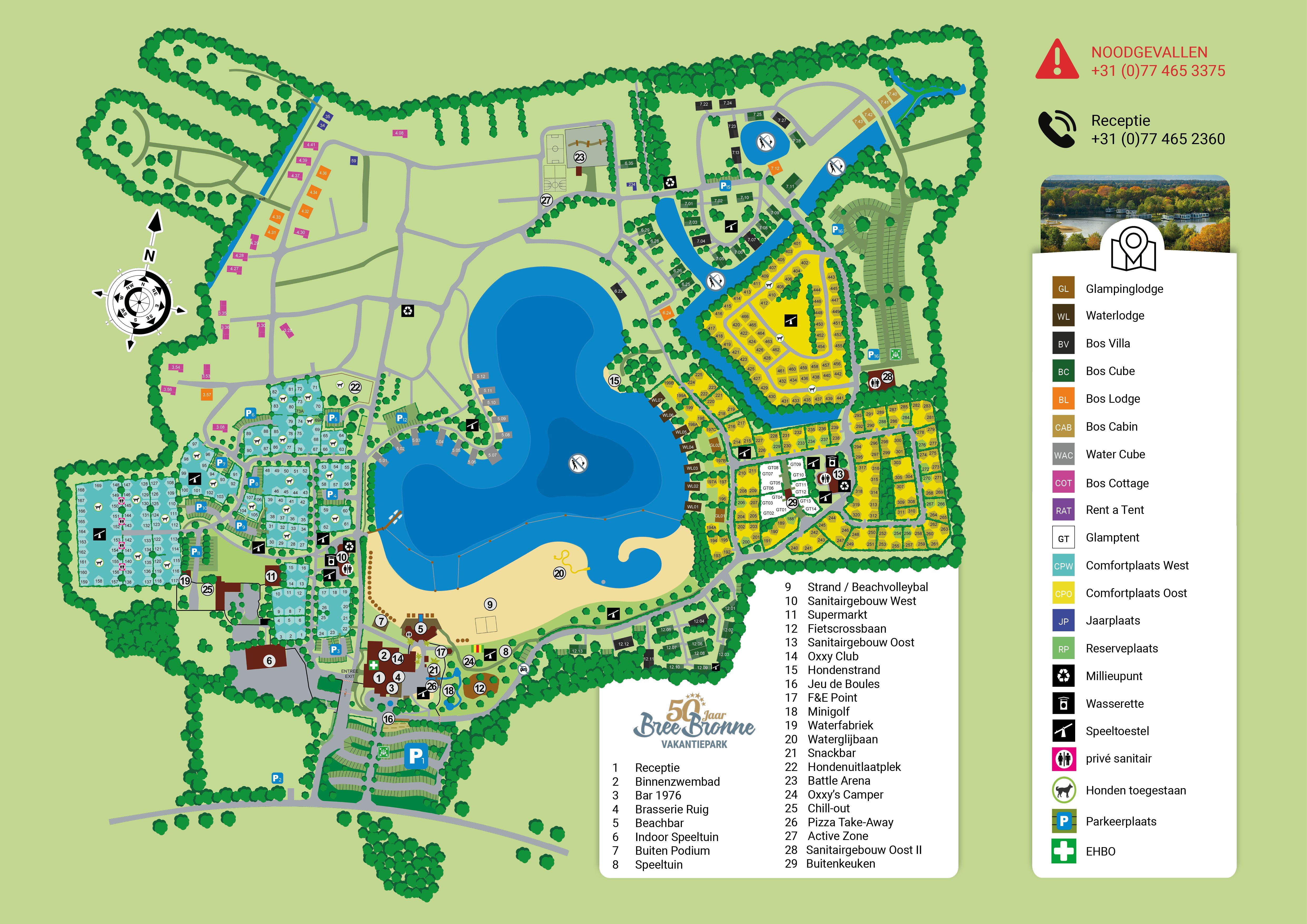 Bekijk hier het park van BreeBronne. Op onderstaande plattegrond staan alle faciliteiten, vakantiewoningen, glampingplaatsen en kampeerplaatsen getoond.